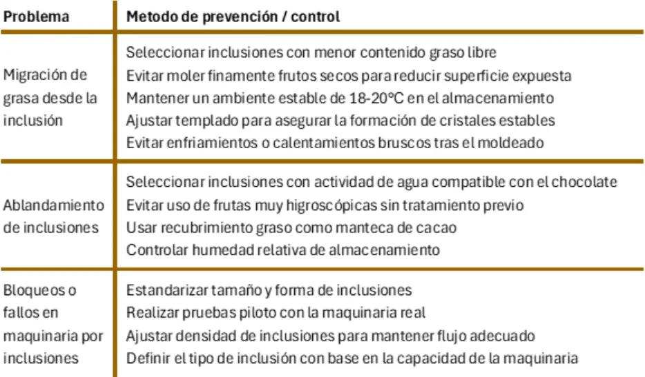 A continuación, encontrarás una síntesis de los problemas más comunes en chocolates con inclusiones y las estrategias para prevenirlos: